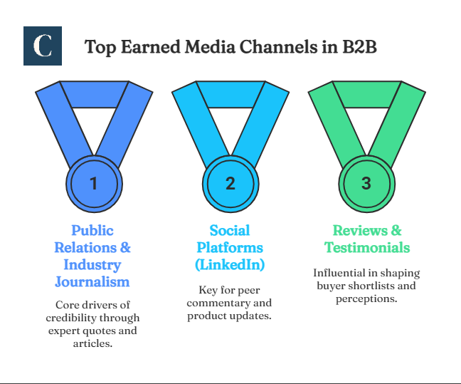 Earned media comes from a mix of channels where buyers already spend time and gather information. Each channel plays a different role in shaping how a brand is perceived, and together they create the external signals that influence B2B decisions.