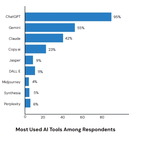 When we look at how African marketers actually use AI in 2025, the picture is both practical and revealing. Our survey shows that 95% of respondents reach for ChatGPT, making it the undisputed favorite. Gemini follows at 55%, while Claude comes in at 42%.