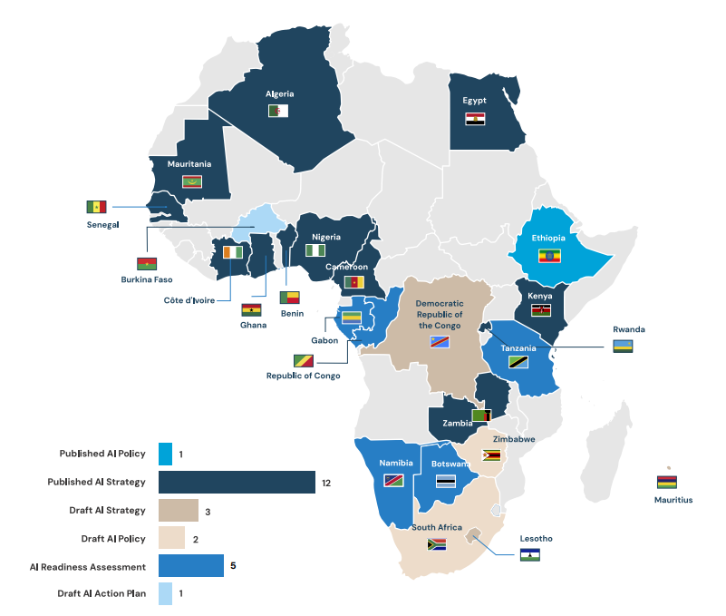However, Benin, Cameroon, and Rwanda have successfully published AI strategies while Côte d’Ivoire officially entered the AI policy space in March 2025.