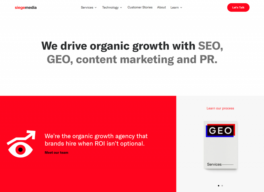Siege Media is an SEO-focused agency that centers its work on content strategy, search-optimized content creation, and digital PR. They aim to create content and assets that earn links, support rankings, and help drive long-term organic growth.